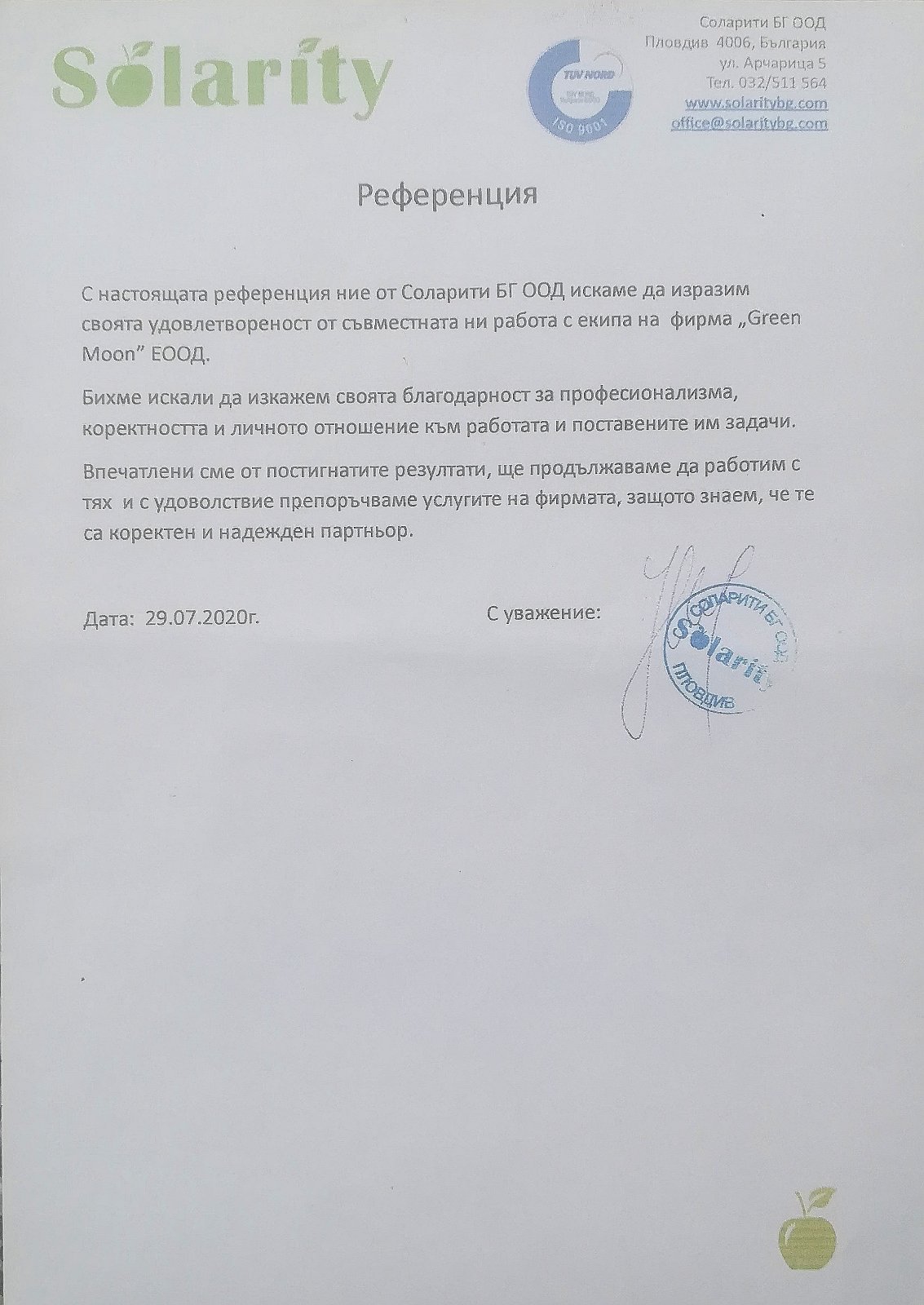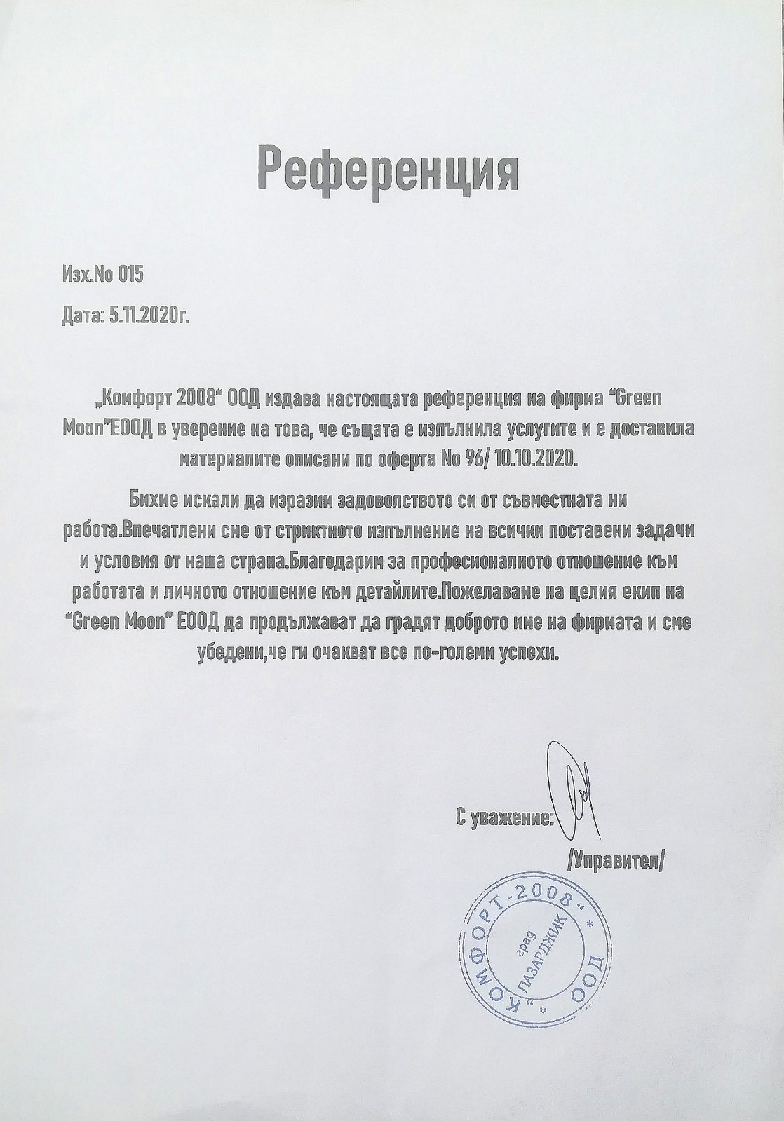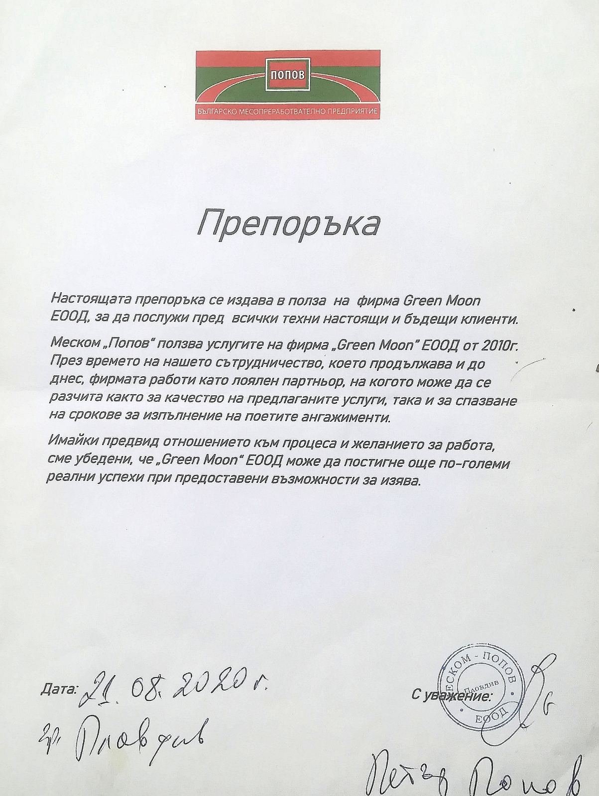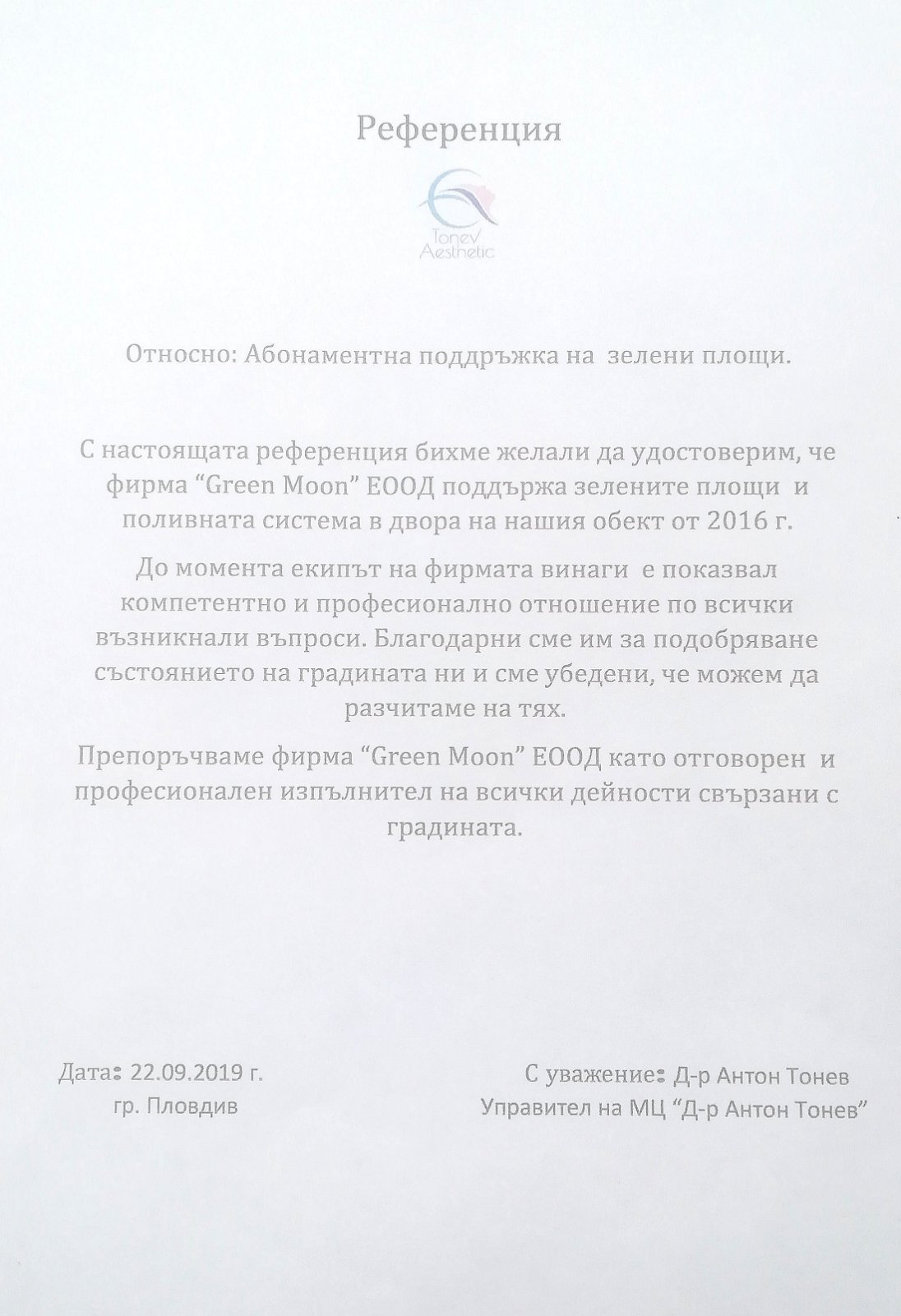 В потвърждение на безупречното качество при изпълнение на нашите дейности, фирма Garden Care има издадени следните референции и препоръки от възложители и партньори: